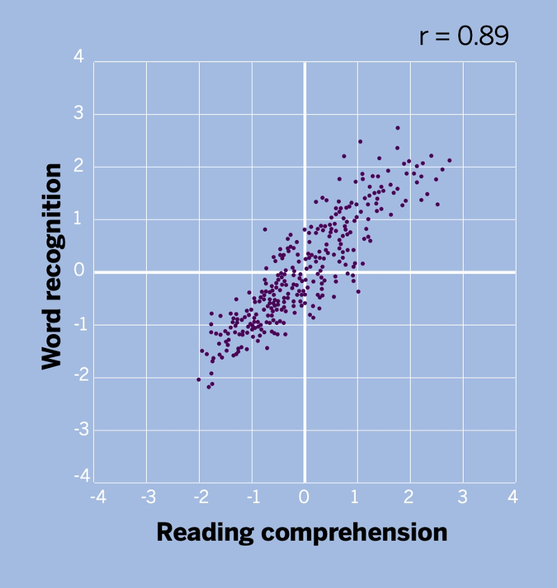 So, yeah, if 89% of reading is simply being able to recognize the words on the page. It stands to reason that the other 11% must be comprehension, knowledge, and vocabulary. Small potatoes compared with word recognition. Yes, I get that’s not what that 0.89 is referring to, but this is how it’s interpreted by SoR advocates who dismiss the need for anything other than word recognition instruction, e.g. phonics. While I have no idea which study or data from the Haskins Lab this graph comes from, I do have other actually published work from a researcher at the Haskins Lab that says something different. To wit:
