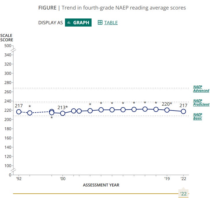 We paid schools to implement the science of reading, they did, and all we could really prove was that schools did indeed do more instruction based on the science of reading. Somehow, though, Emily Hanford and others present us with a story that “[t]here's an idea about how children learn to read that's held sway in schools for more than a generation — even though it was proven wrong by cognitive scientists decades ago.” Given that Reading First went defunct in 2008, this statement seems inaccurate! There’s even an episode of the podcast dedicated to Reading First which presents the failure of the program as a political shutdown, something pressed for by Democrats angry that some members of the Bush administration had financial connections to curriculum companies recommended by the program and actions by Marie Clay to get the program shut down because her reading curriculum was not included. Corruption aside, I think it’s important that the impact study itself finds the program ineffective. The impact report, the fact that Reading First did not produce a statistically significant impact on student reading comprehension, is not mentioned in the podcase episode about Reading First. Given the depth and breadth of the reporting Emily Hanford did for this series, I can only assume the impact study was omitted because it did not support the overall argument in favor of the Science of Reading that she is trying to advance. (See also Gamse et al., 2008; Jackson et al., 2007. I don’t have easily linkable versions of these articles, but I’ll try to remember to go looking. They’re citations I have on hand from other things I’ve written.)