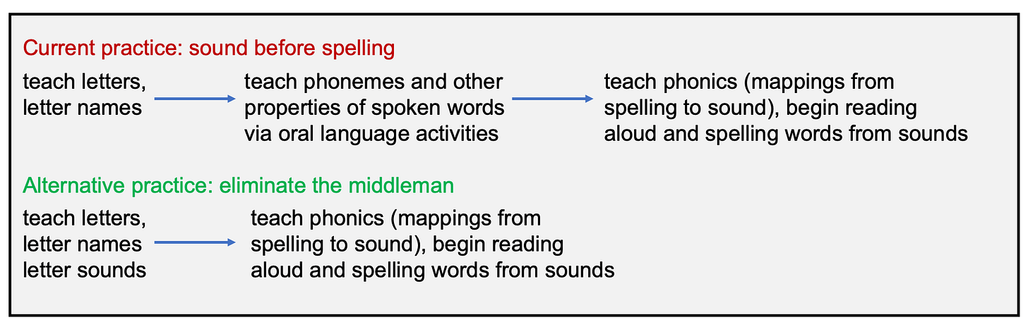 [t]he initial hurdle is grasping the alphabetic principle, whereby units in the written code (graphemes) represent units in the spoken language (phonemes). Several potential obstacles arise. First, as I’ve already noted, phonemes are an abstraction that depends in part on exposure to print.